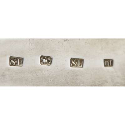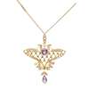 of pierced scrolling design, millegrain set with a round cut amethyst and throughout with half pearls and small demantoid garnets, suspending a pear shaped amethyst drop, stamped 15ct, to an 18ct gold flattened curb link chain,