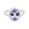 claw set with an oval cut Tanzanite in a border of round brilliant cut diamonds, to a white metal shank stamped G14K