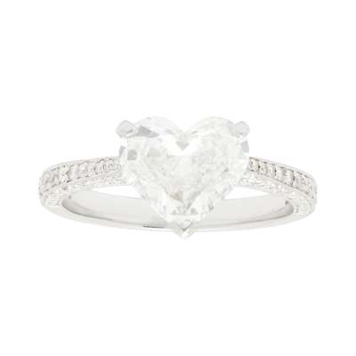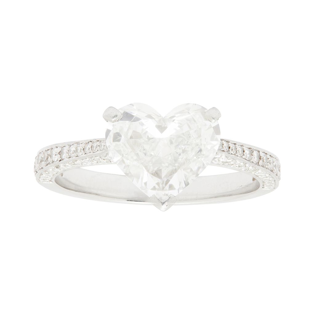 claw set with a heart shaped diamond, the tapering shoulders set throughout with graduated round brilliant cut diamonds, to a plain platinum shank; with accompanying GIA report for the principal diamond, dated 07.12.2004, numbered 14018972, stating that the diamond is 2.09cts, D colour, IF clarity; in original Boodles box