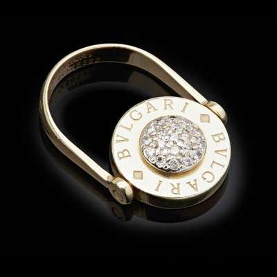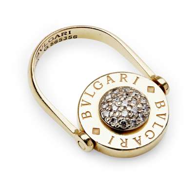 the central circular disc, pavé set with round brilliant cut diamonds, the border engraved BVLGARI, hinged to a tapered band, stamped 18K BVLGARI