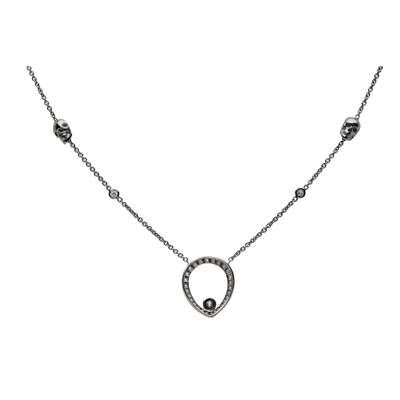 the open pear shaped pendant set with graduated round brilliant cut diamonds and a single collet set black diamond, the integral 18ct oxidized gold belcher link chain with collet set diamond detail and skull links, in original Theo Fennell box