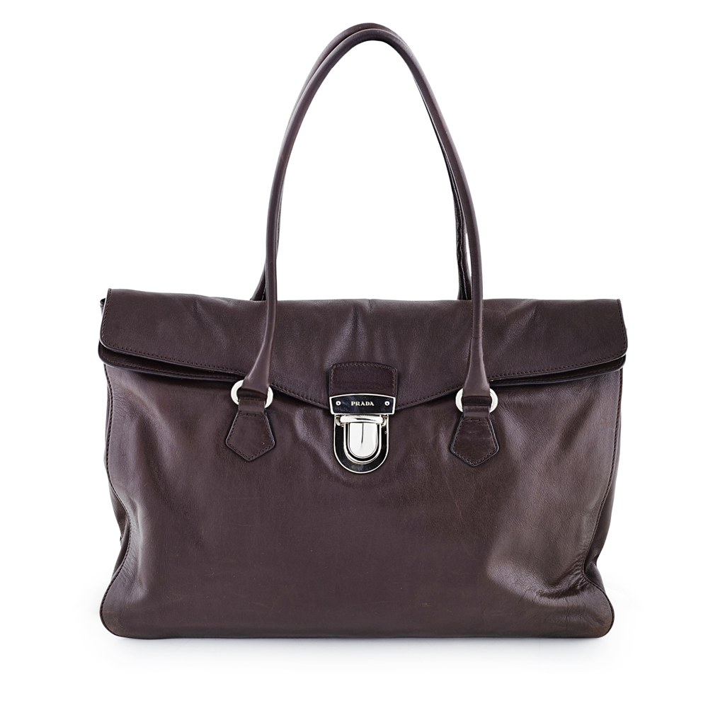 modelled in brown leather, with white metal hardware, internal zip pocket; together with Prada authenticity card, dust bag and original box