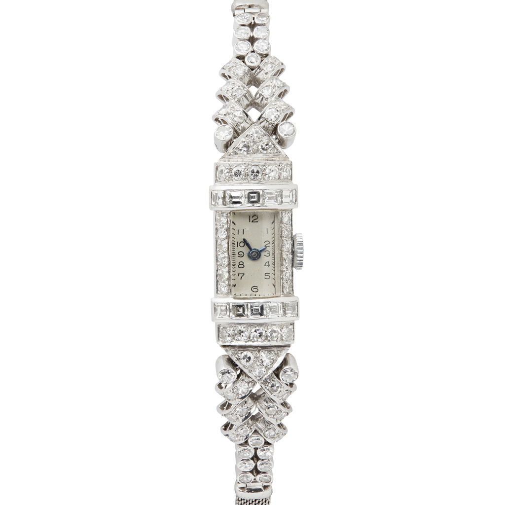 the arched glass with conforming diamond set bezel, with round and square cut diamonds, diamond set triangles, to a tapering stepped diamond set mount to mesh strap, fold over clasp, case marked 'All Plat', rear hinged cover engraved rectangular panel