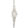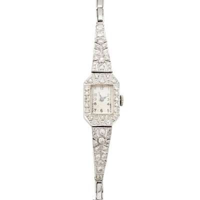the rectangular dial with Arabic numerals, the case set with eight cut diamonds and engraved detail, tapering articulated shoulders similarly set, to a flexible link bracelet