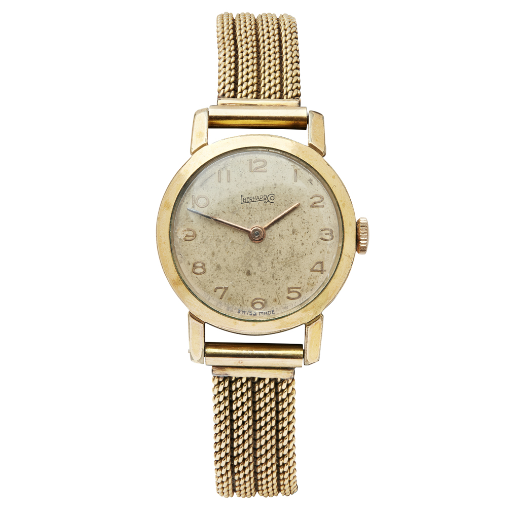 plain case, cream dial, Arabic numerals, lever movement, with a yellow metal mesh bracelet fold over clasp, stamped 750, rear back engraved