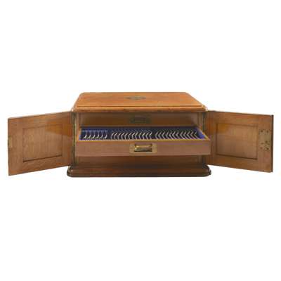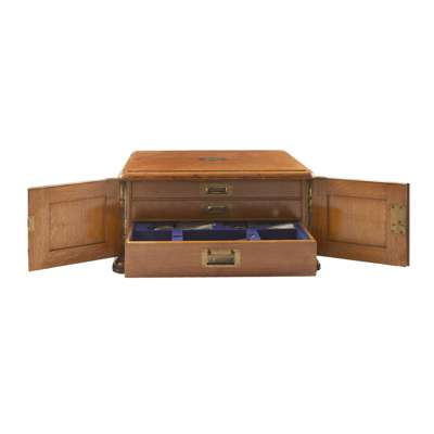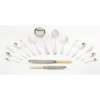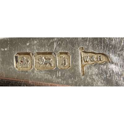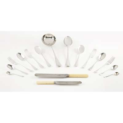 Walker & hall, Sheffield 1900, comprising of a soup ladle, a basting spoon, two sauce ladles, a pair of sugar tongs, a sugar shovel, twelve table forks, twelve dessert forks, twelve table spoons, twelve dessert spoons, eleven teaspoons, six egg spoons, twelve bone handled table knives, twelve side knives and carving together with two salt spoons, a mustard spoon and an unrelated wine funnel presented in a fitted canteen (qty)