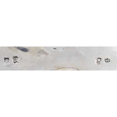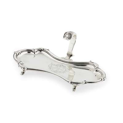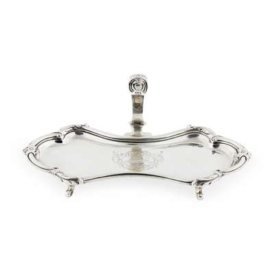 previously marked for Paul De Lamerie, antique plate committee case no. 9182, of conventional waisted shape, shell clasped handle, engraved armorials, moulded leaf clasped border, four scroll feet