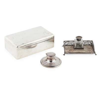 J.B, London 1900, of rectangular form, engraved inscription, crest and motto, gilt interior with cedar divisions; a capstan silver inkwell; a small desk inkstand of rectangular form, pierced three quarter gallery, pen recess and silver mounted glass inkwell (3)