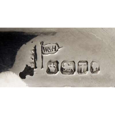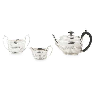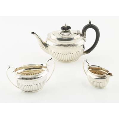 Walker and Hall, Sheffield 1886, comprising, teapot, two handled sugar basin and milk jug, all of oval form, gadrooning to bottom half of body, bright cut engraving, C scroll handles (3)