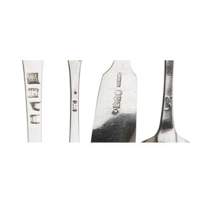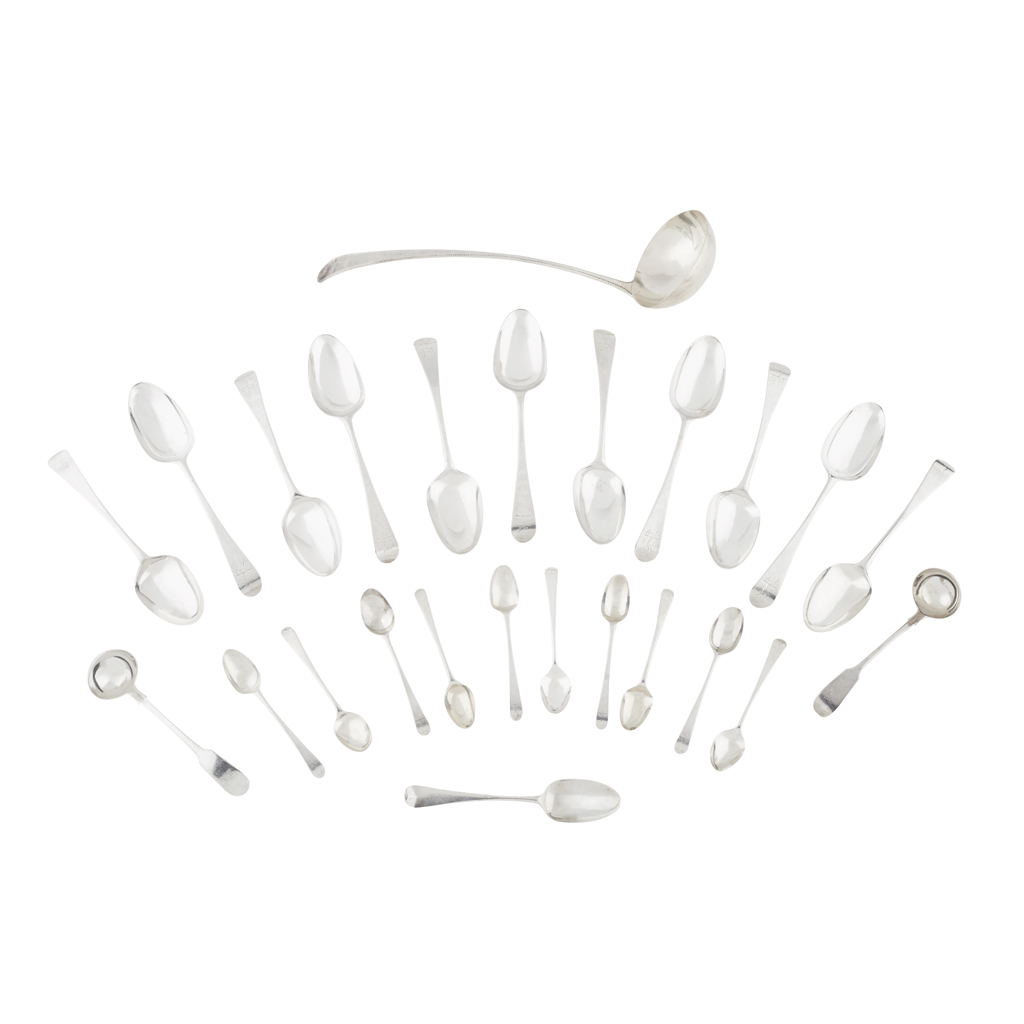 possibly George Greenhill Jones, London 1785, of Old English pattern, engraved stag/ 1759 to terminals and three similar earlier 18th century examples; together with a soup ladle, JJ, London 1777, of Old English pattern with threaded border, two sauce ladles and a collection of teaspoons (qty)
