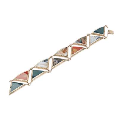 composed of ten triangular links, each set with various bloodstone, banded and moss agate panels, the yellow metal mounts with engraved detail, concealed clasp, unmarked