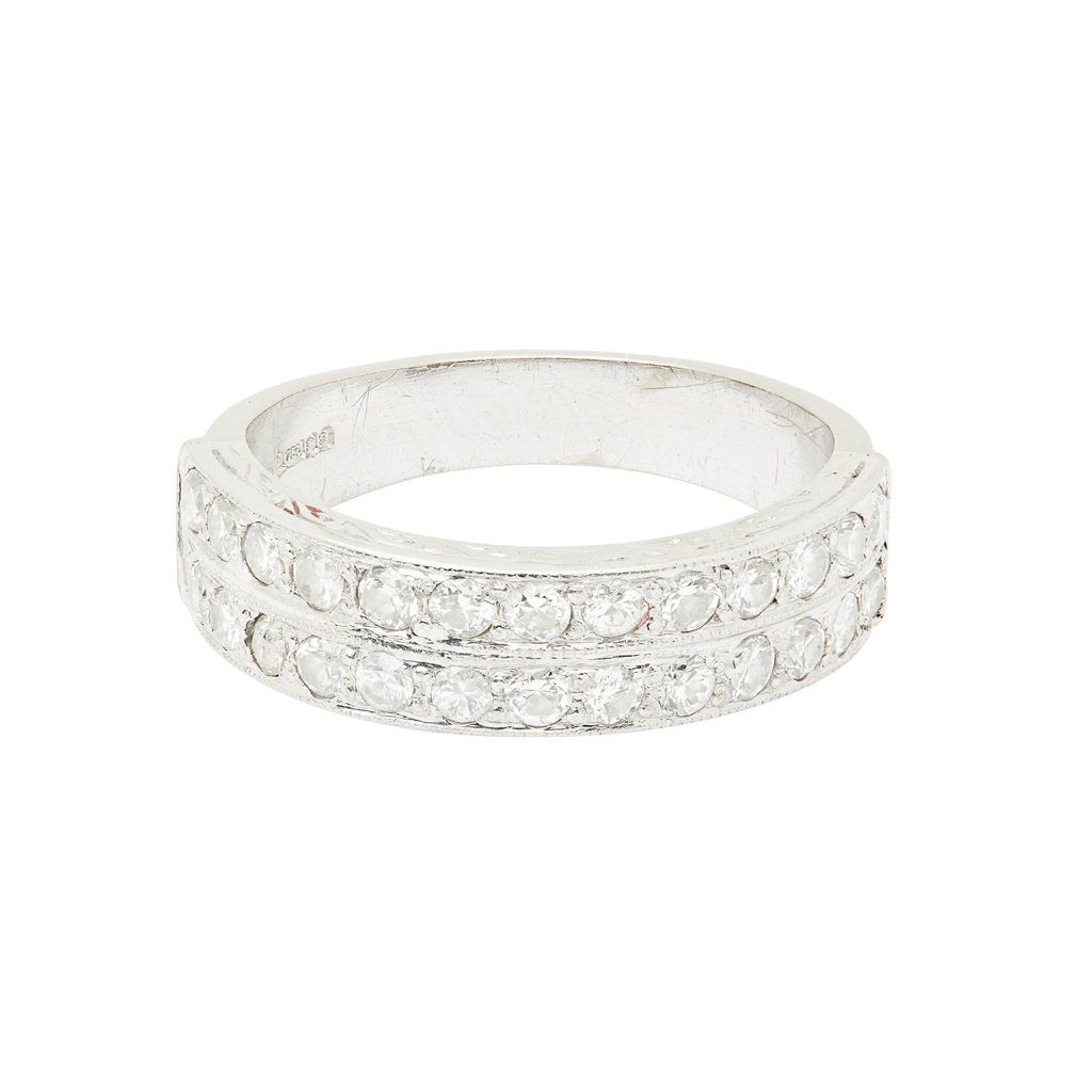 pavé set with two rows of round brilliant cut diamonds, to an 18ct white gold shank