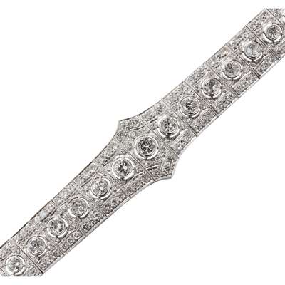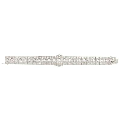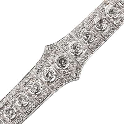 of articulated design, the graduated rectangular panels each collet set with a central round cut diamond and throughout with small round and eight cut diamonds, with engraved detail to sides, concealed clasp and safety clips, unmarked