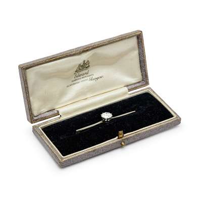 claw set with a single round brilliant cut diamond, to a plain unmarked white metal bar brooch