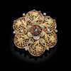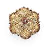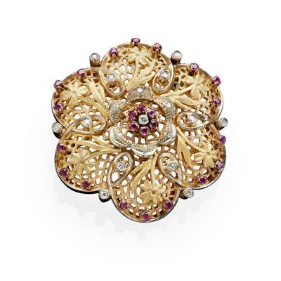 of pierced foliate design, the central cluster claw set with a round brilliant cut diamond in a border of rubies, surrounded by a border of collet set diamonds and an outer border of claw set rubies, indistinctly marked