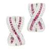 of cross over ribbon design, channel set with two rows of square cut rubies each between a border of small round brilliant cut diamonds, to post and clip fittings, stamped 14k