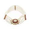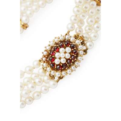 comprising of four rows of cultured pearls with three round cut garnet spacers, the clasp set with an oval cluster of alternating claw set pearls and garnets, stamped 9ct