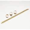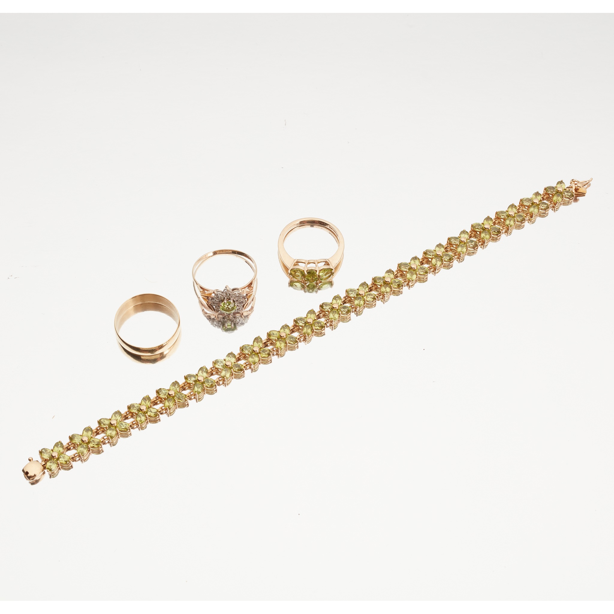 to include a peridot and diamond set cluster ring, claw set with a round-cut peridot in a border of illusion set eight-cut diamonds, to a plain shank; together with a peridot set bracelet, composed of floral clusters; a peridot set three stone ring and an 18ct yellow gold wedding band
