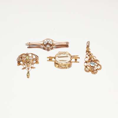 to include a seed pearl and peridot set brooch, stamped 9CT; together with a citrine set bar brooch, unmarked, a blue paste and seed pearl set pendant, stamped 9ct; and an aquamarine and seed pearl set bar brooch, unmarked