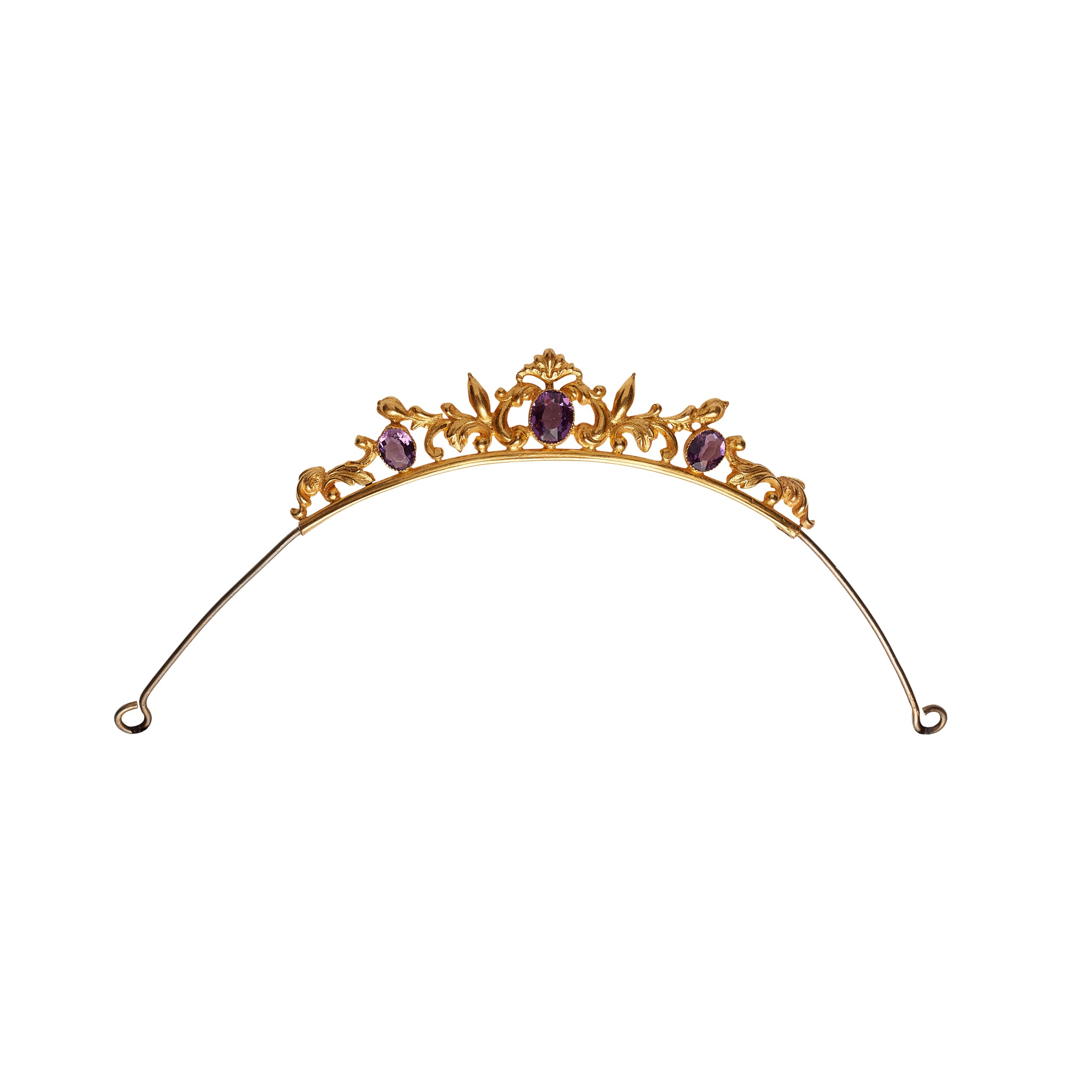 of scrolling design, set with three graduated oval-cut purple pastes, unmarked