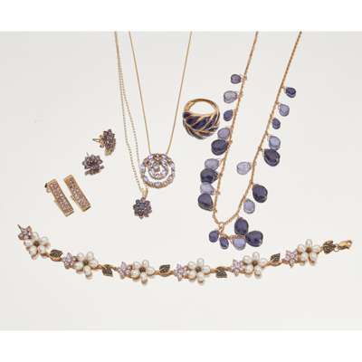 to include a 9ct gold cultured pearl, Tanzanite and black diamond bracelet; a pair of iolite cluster earrings, and matching pendant, to a trace link chain, unmarked; a 9ct gold-fringed iolite bead necklace, a circular Tanzanite set pendant, stamped 375, to a 9ct gold snake link chain; a 9ct gold lapis lazuli set ring and a pair of 9ct gold rectangular iolite set earrings