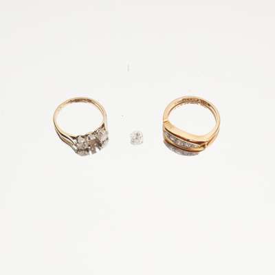 claw set with three graduated old round-cut diamonds, to a plain yellow metal shank (one diamond loose); together with a five stone diamond set ring, the navette shaped panel millegrain set with five eight-cut diamonds, to a plain yellow metal shank stamped 18ct
