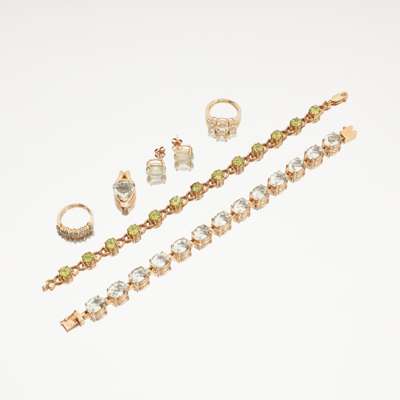 to include a 9ct gold peridot and white topaz set bracelet, a 9ct gold prasiolite bracelet; a prasiolite pendant, unmarked; a pair of 9ct gold prehnite earrings, a 9ct gold three stone yellow Kunzite set ring, and a 14k gold Alexandrite set ring