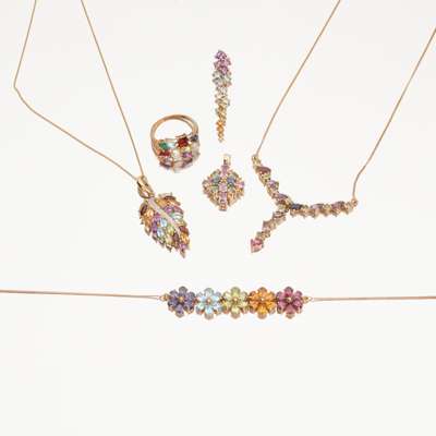 to include a 9ct gold multi-gem set cluster ring, a multi-gem set floral necklace; a 9ct gold multi-gem set drop pendant, a 9ct gold multi-coloured sapphire set cluster pendant; a 9ct gold multi-gem and diamond set leaf pendant, to a trace link chain; a 9ct gold sapphire set necklace