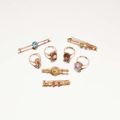 to include a 9ct gold smokey quartz set ring, a 9ct gold fire-opal and pearl set cluster ring; a pink quartz set ring, stamped 9ct; a 9ct gold orange paste set ring and various gem set bar brooches