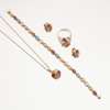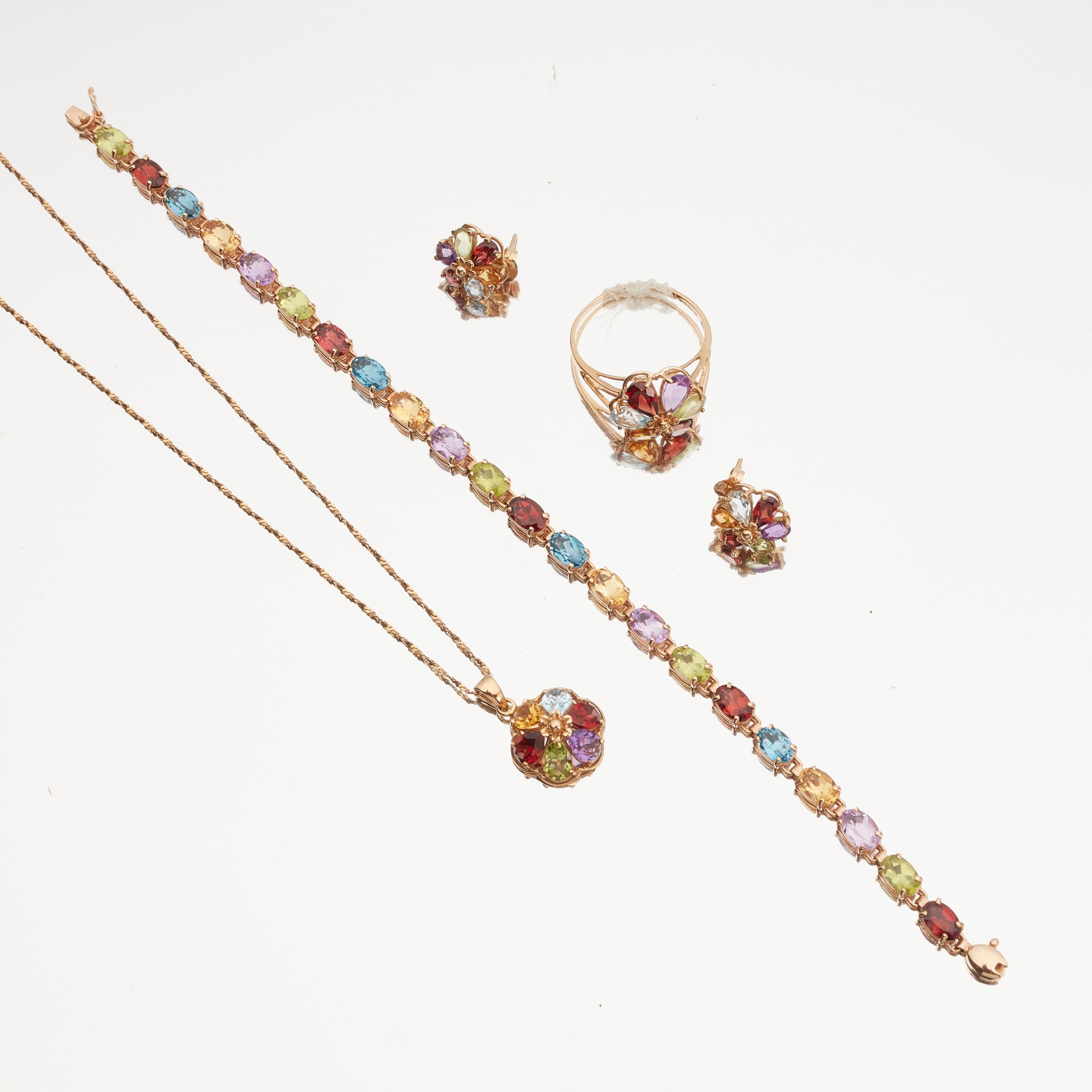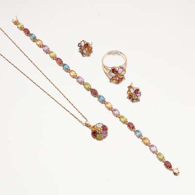 comprising a pendant, a pair of cluster earrings and a ring, each composed of floral design each set with various pear-shaped coloured gems, with a matching bracelet, set with a continuous row of various alternating gems