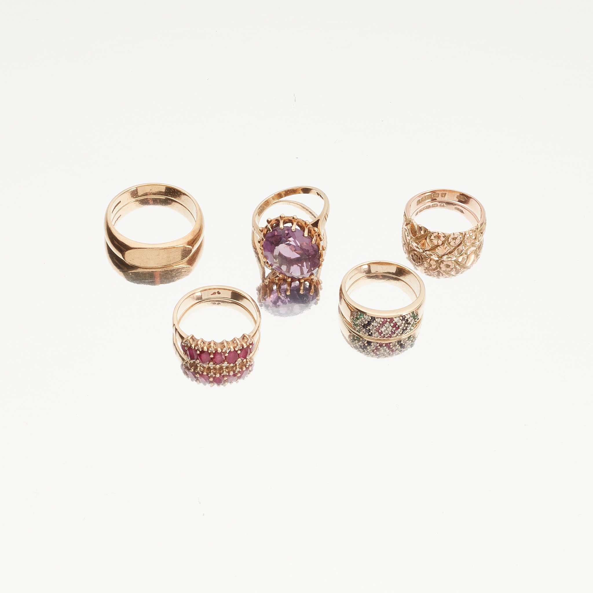 to include a 9ct gold amethyst set cocktail ring; a ruby and diamond set ring, to a plain yellow metal shank, stamped 9c*; a sapphire, ruby, emerald, and diamond set band, stamped 375; a plain 9ct gold signet ring and a 9ct yellow gold band with embossed floral decoration