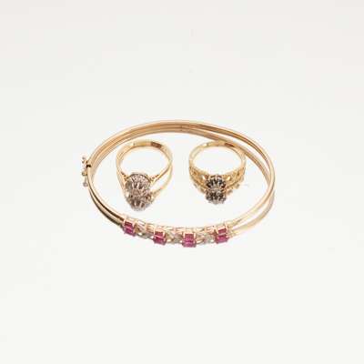 to include a ruby and diamond set bangle, stamped 9k; an 18ct gold diamond set cluster ring, and an 18ct gold sapphire and diamond set cluster ring