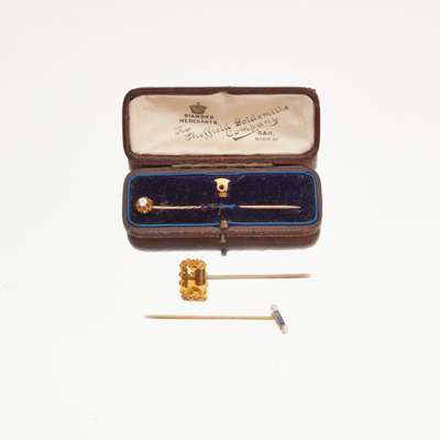 to include a rectangular step-cut citrine set pin, unmarked; a sapphire and pearl set stick pin, stamped 15ct; and a diamond set stick pin, with alternative stud mount, unmarked