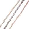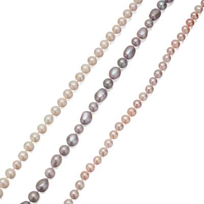 the first composed of a single strand of cultured white pearls, to a lobster clasp, stamped 375; a single strand of pinkish-cream pearls, to a lobster clasp, unmarked; a single strand of grey pearls, to a barrel clasp, stamped 585