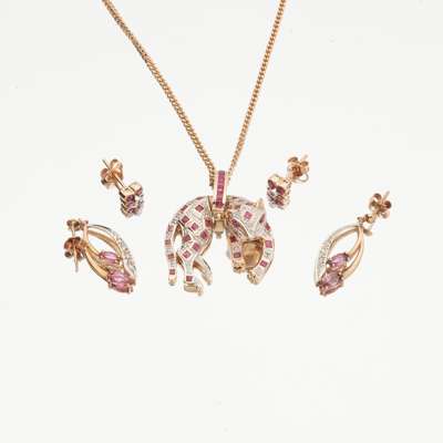 modelled as a panther, set throughout with square-cut rubies and eight-cut diamonds, the loop bale channel set with a row of calibre-cut rubies, to a 9ct yellow gold fancy link chain; together with a pair of 9ct gold ruby and diamond set pendant earrings, to post and butterfly fittings and a pair of ruby and diamond set cluster earrings, stamped 375, to post and butterfly fittings