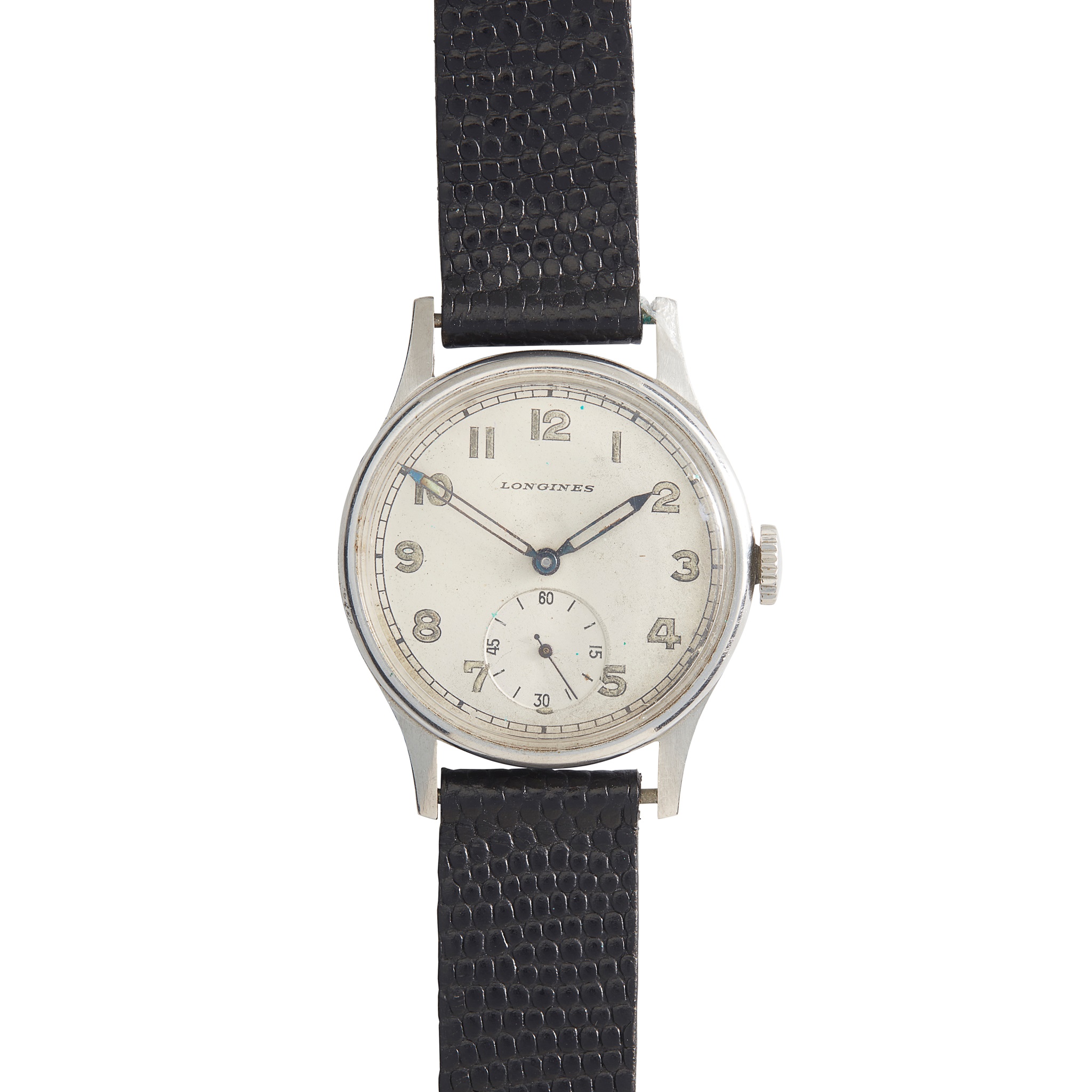 early 1940s, stainless steel case, signed Longines manual wind movement, the round white dial with lume-filled Arabic numerals, sunken small seconds at 6, railroad outer seconds track in black, lume-filled sword hands, domed crystal, on a later strap, no box and papers