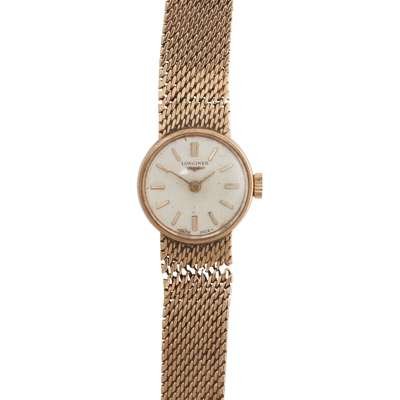 9ct gold case, manual wind movement, round dial with applied gold baton hour markers, gold pencil hands, on an integrated gold mesh bracelet strap with nine carat gold clasp, in box, no papers