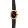 1970s, 18ct gold case, manual wind movement, signed oblong black dial with red stripe diagonally placed from 11 to 5, lacking numerals, gold sword hands, wide ribbed bezel with diagonal pattern, the caseback with 60812 10617, on a generic strap, no box or papers