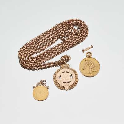 for Cumberland Bowling association 1908, won by R.Tyson, Birmingham 1907, to a belcher link chain stamped 9ct; together with another 9ct gold Runner-Up medal for 1928, Birmingham 1927; and a 1904 half sovereign