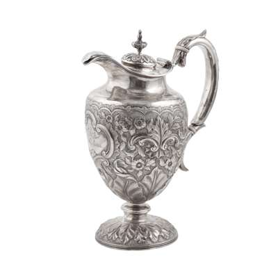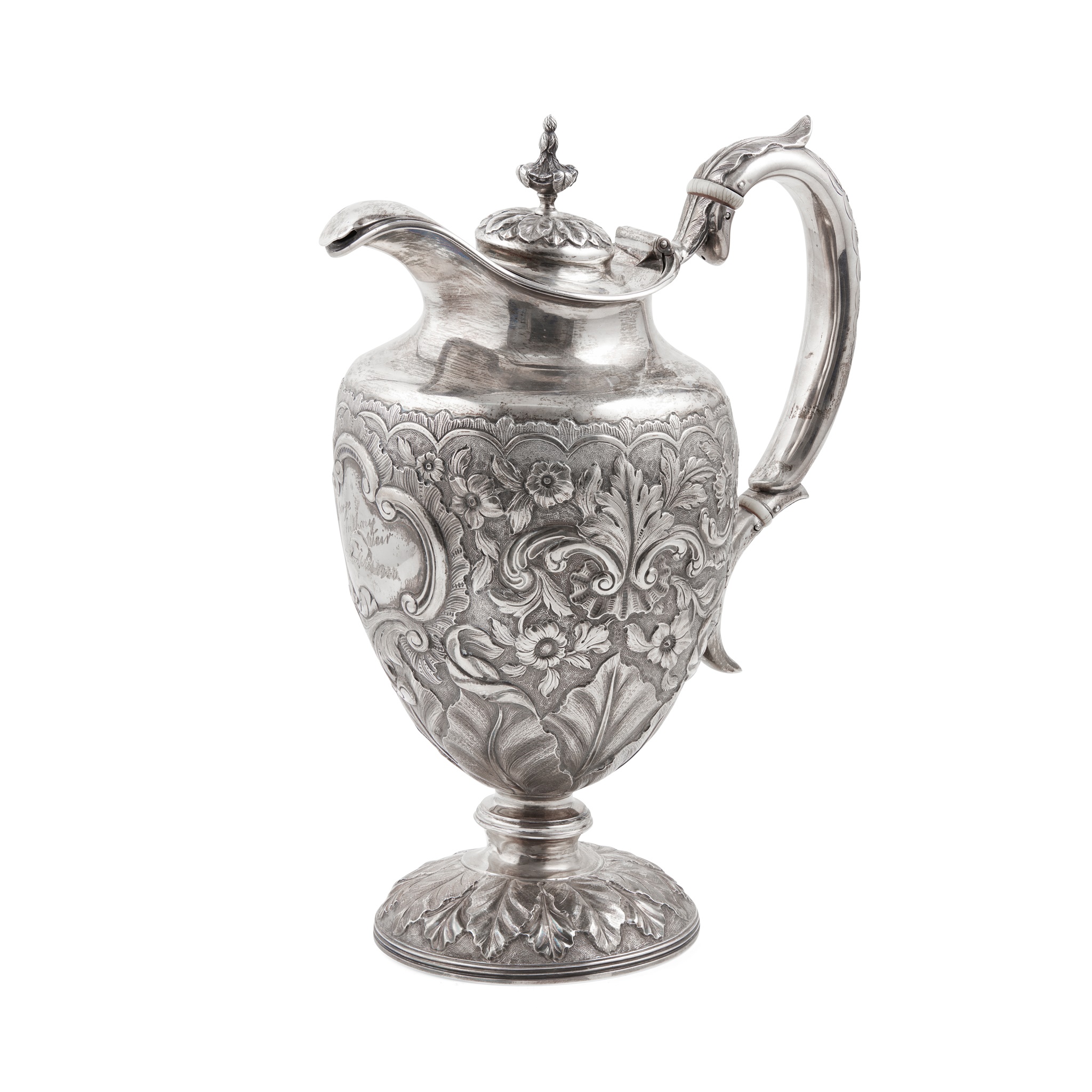 probably Indian, unmarked of baluster form with allover floral decoration, acanthus clasped C scroll handle, presentation engraving to moulded cartouche