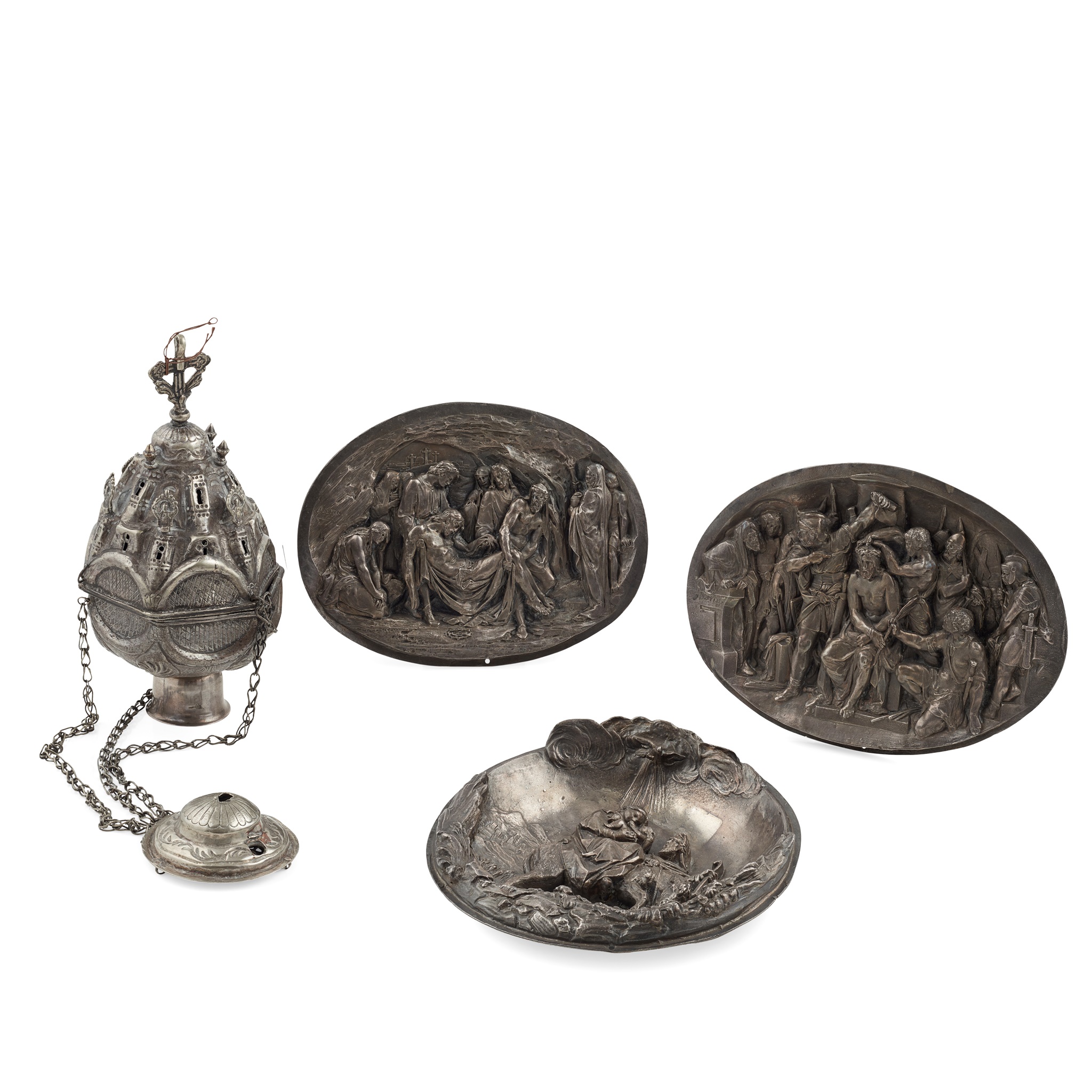 unmarked, the deep relief showing biblical scenes, two signed; together with a white metal incense burner of traditional form
