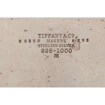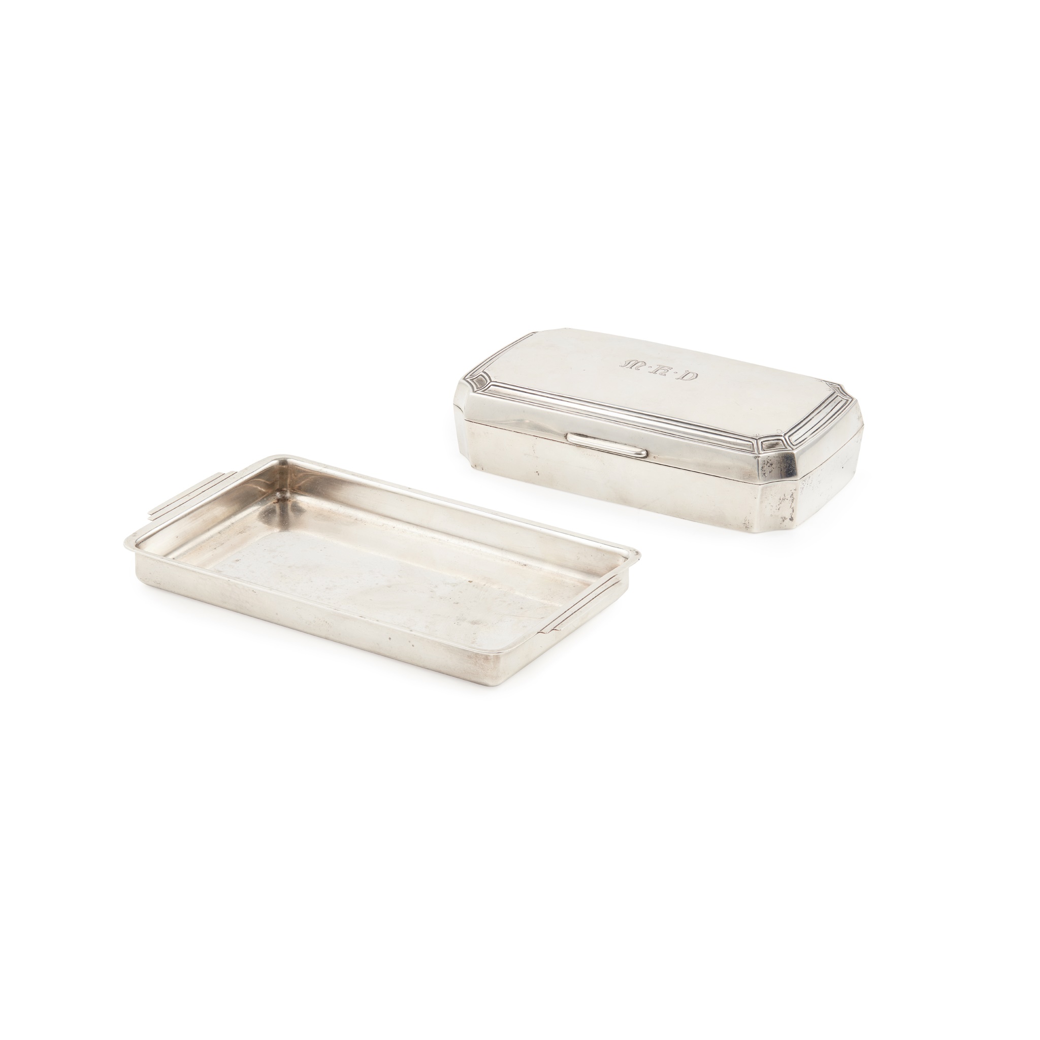 the box of rectangular form with canted edges, engraved M.H.D. to centre, the tray with stepped handles