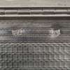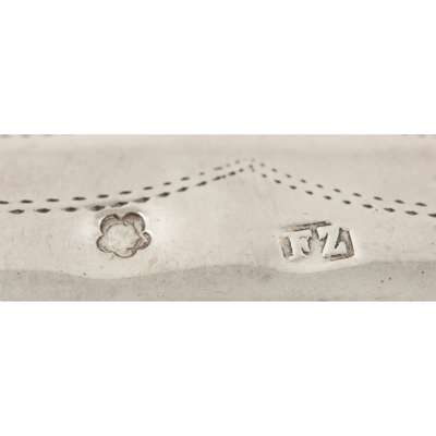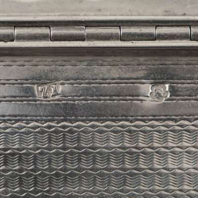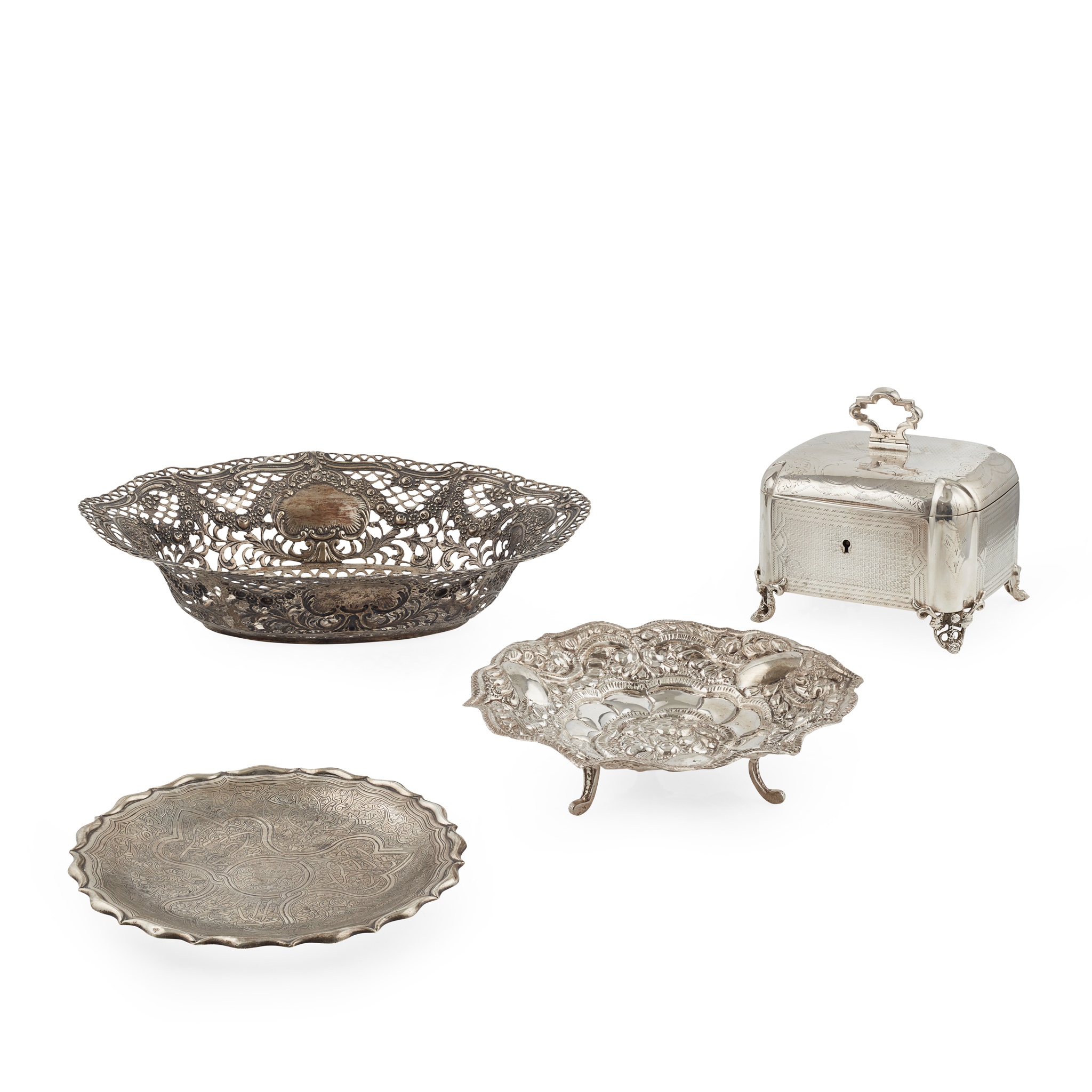 marks for 800 fineness, of rounded rectangular form, with all-over engine turned decoration, raised on four cast bracket feet with loop handle and key; together with a central European silver basket, with a heavily embossed cherubic scene to the base and pierced sides and two smaller middle eastern dishes, one with Egyptian marks