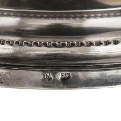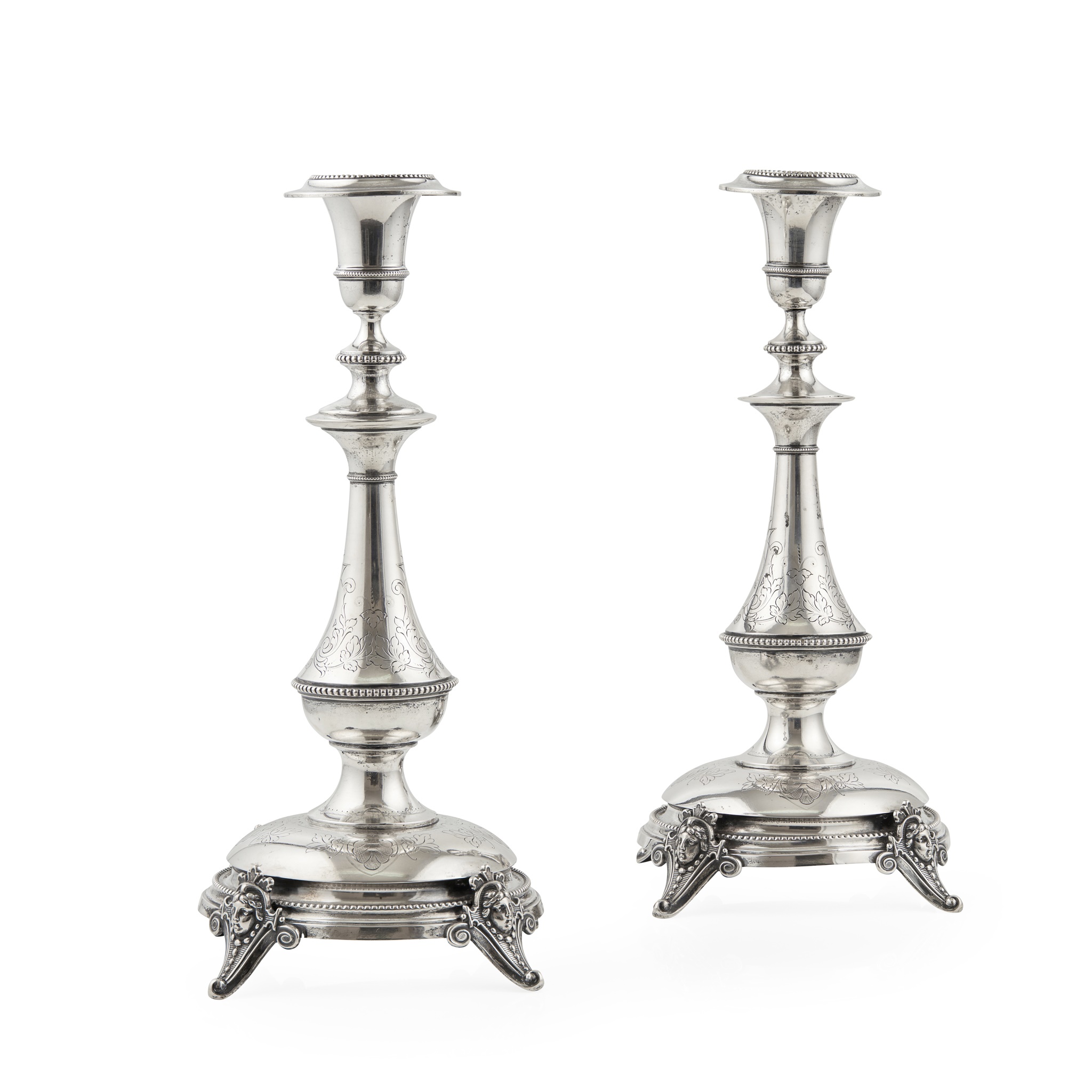 stamped M 800, possibly Gustav Memmert of Berlin, each of baluster form, beaded borders with engraved scroll and foliate detail, raised on four cast bracket feet with cherub mask detail