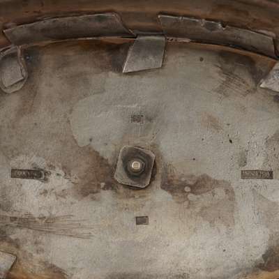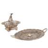 possibly Portuguese, filigree work to the base, gilt centre, with simple scroll; together with a twin compartment basket, with upright division with ball finial and bird surmounted, the everted sides of filigree decoration, raised on four paw cast bracket feet