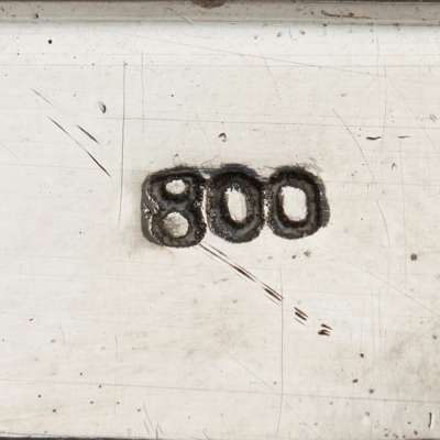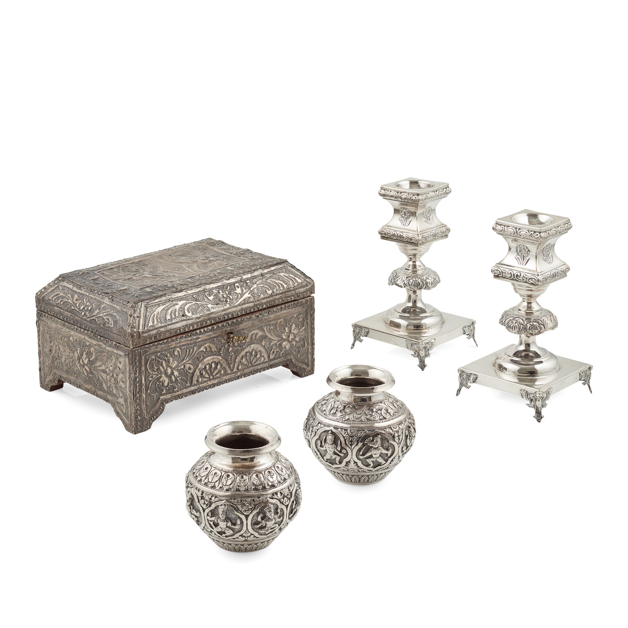marked 800, each with square scones above a knopped stem; together with a pair of Indian small vases, with traditional high relief decoration and an unmarked table casket