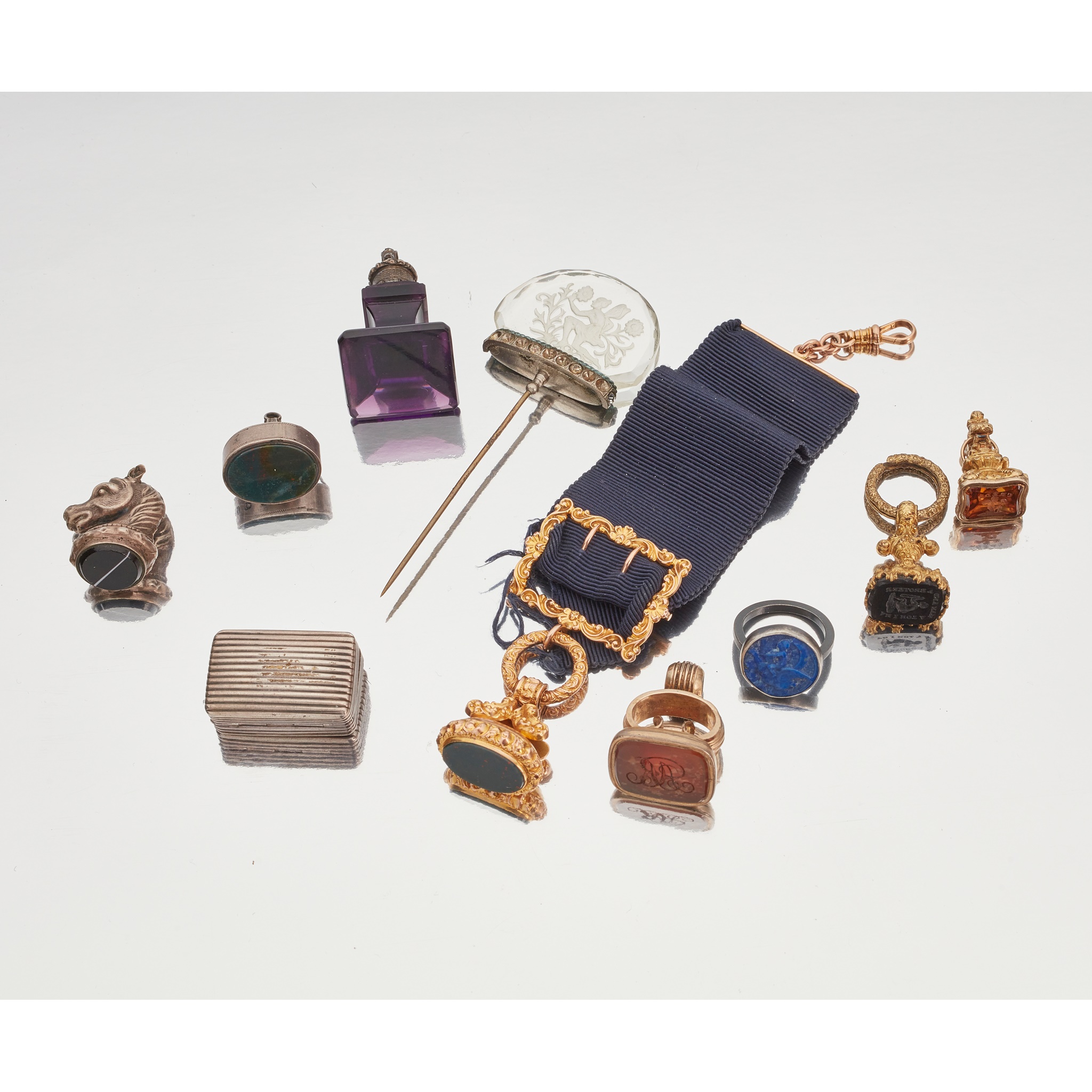 to include a Georgian fob seal, with a blank agate matrix, well chased mounts and on ribbon with buckle; a silver horses head seal with banded agate matrix; a square purple glass seal of ogee form with silver suspension, blank matrix; a small 19th Century gold fob seal engraved putto and motto; a Georgian fob seal engraved initials; a silver-mounted fob seal, plain hardstone matrix with a compass set to the reverse, Thomas James Skelton, Birmingham 1897; a pin with a carved reverse cameo glass panel; a silver-mounted ring, rub over set with a carved lapis lazuli cameo of a putto on the back of a swan, possibly Roman, the reverse of the ring mount stamped AG, plain shank; a 19th Century gilt metal fob seal, the matrix carved with a kneeling chained figure, hands clasped, engraved 'Am I not a man and a brother' chased suspension ring; a small vinaigrette, Samuel Pemberton, Birmingham, ribbed outer case, gilt interior