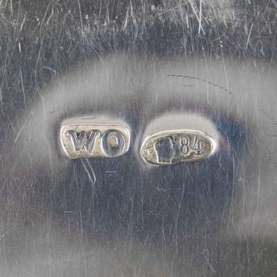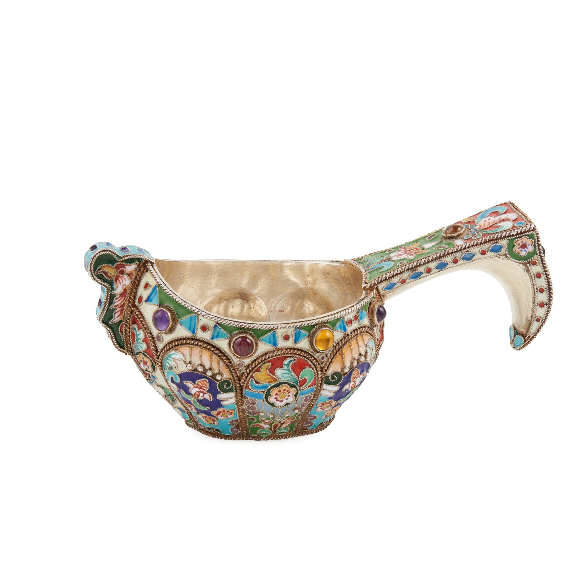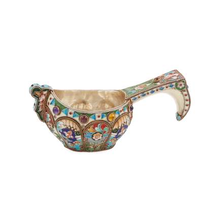 bearing marks WO, 84 standard, of traditional form with rope twist borders, the body collet set with various gem cabochons and embossed panels decorated with varying colours of enamel, the handle of similar decoration