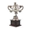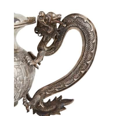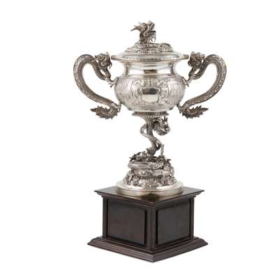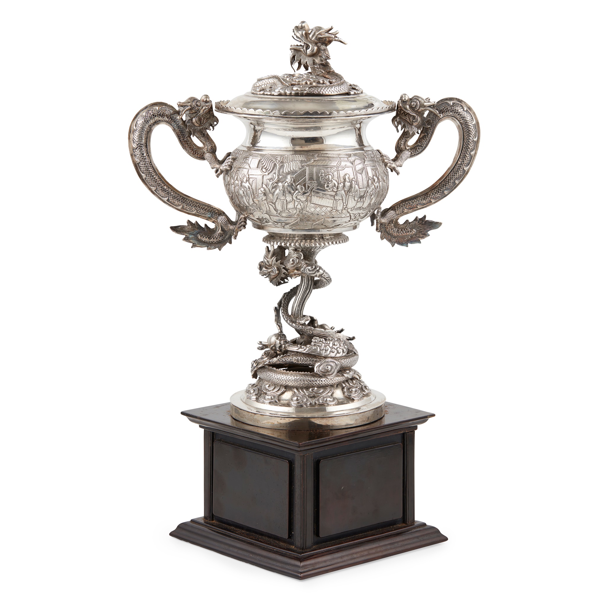marked to base for Leeching, circa 1870, the cup of globular form with embossed and chased scenes depicting Chinese life, the twin handles formed as scrolling dragons, the stem modelled as intertwined dragons, on a circular foot, the pull-off cover with dragon within the clouds; with a hardwood plinth and engraved presentation plaque from the 'Hong Kong & Whampoa Dock... 1871'
