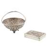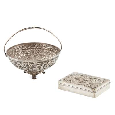 marks for Wang Hing and Company, of rectangular form, embossed decorated trailing dragon to hinged lid; together with an Asian style swing handled bowl, allover embossed floral decoration, raised on four bracket feet